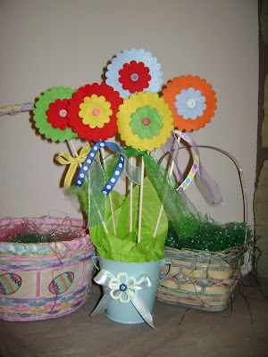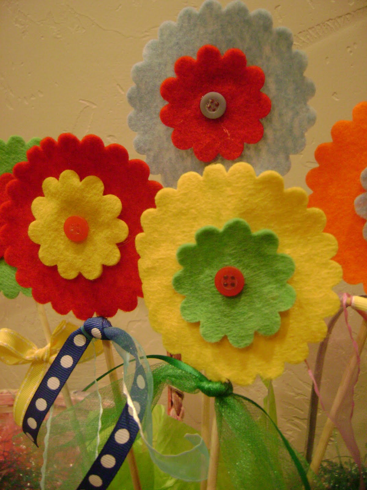 I used buttons to garnish the flowers, a blue tin bucket I found at the dollar store and some kabob sticks to glue the flowers on to. I am all about the hot glue!