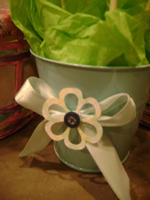 stuck a foam ball into the bucket, stuck the flowers in, added some tissue paper and look how stinkin cute it turned out!!