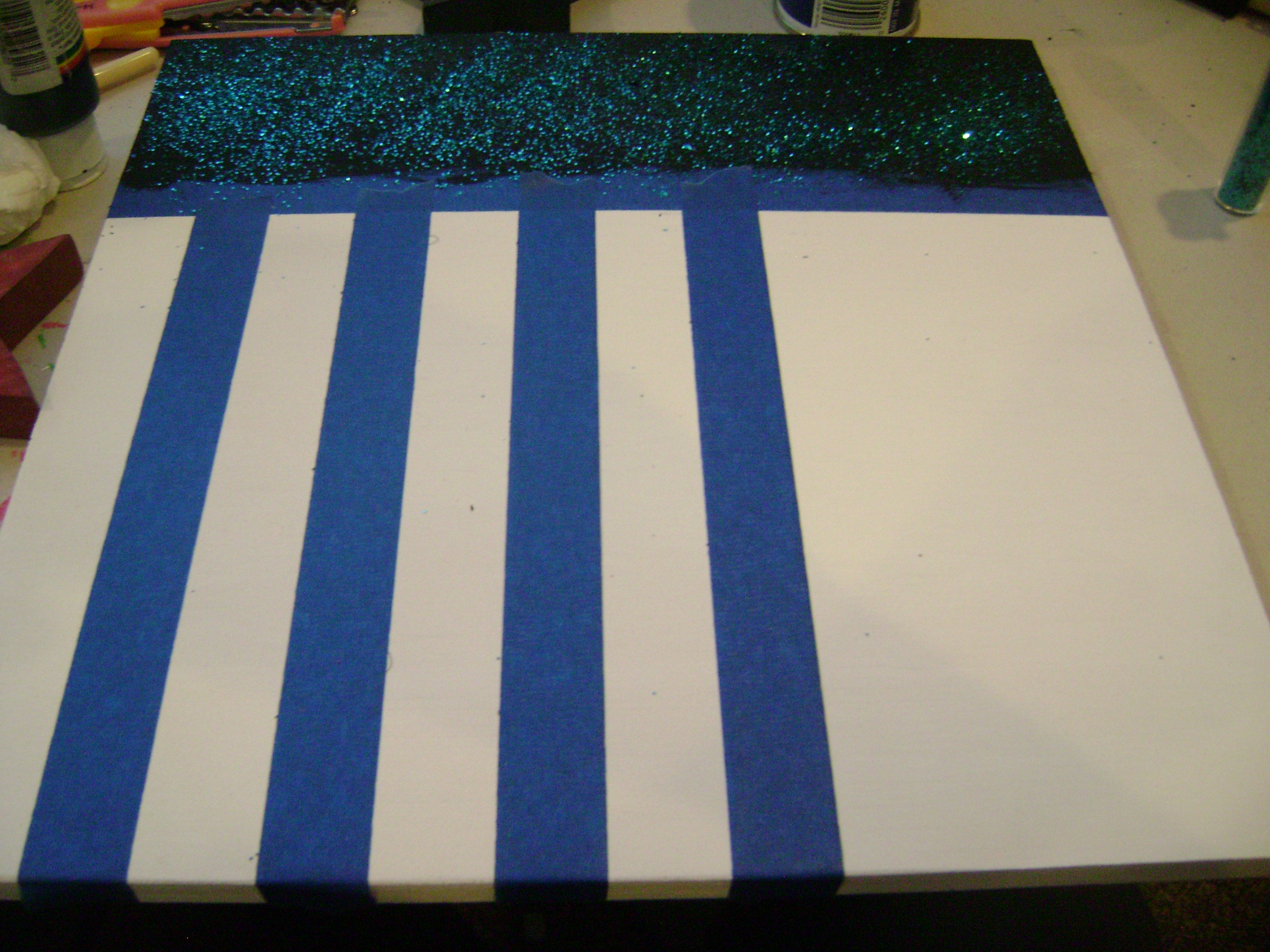 Pretty simple! I took a 12×12 size board and taped it off somewhat like a flag. Painted the entire board white. Once dry I measured where I wanted the stripes then went to town painting on the red and blue.