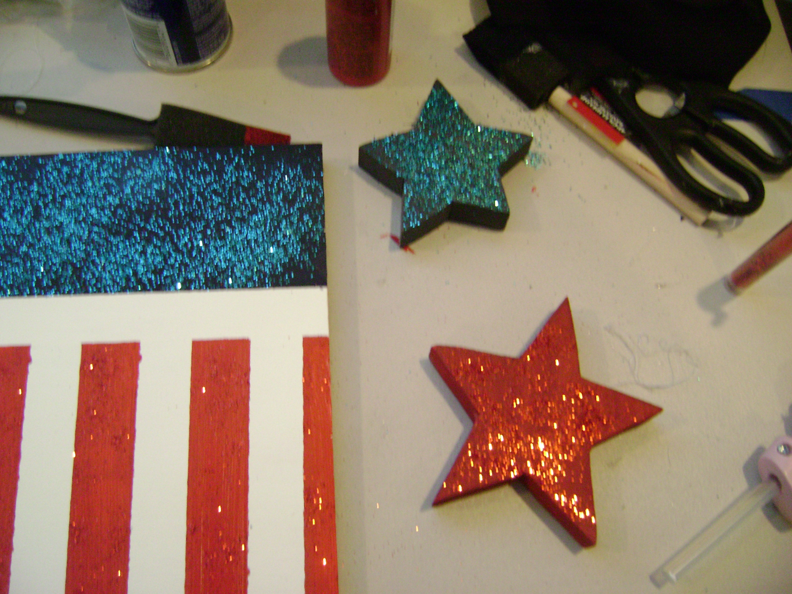 I cut out some wood stars to add some demension to my flag and of course glittered it all! 😉 I drilled some holes in the corners and added wire then hung it on my post!