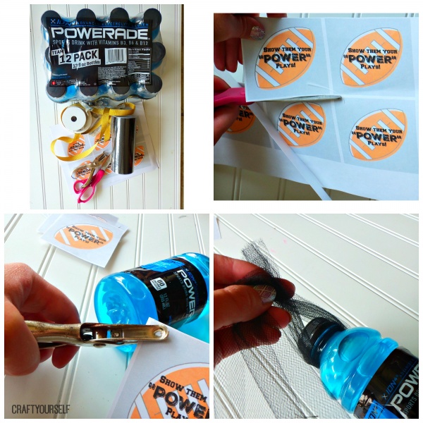 Cut out around each football printable, next punch a hole in the top left corner. Then measure your black tulle around the lid of the bottle leaving enough room to tie.