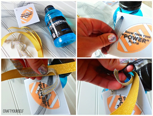 Cut black tulle and ribbons to desired sizes. Tie black tulle underneath the bottle lid, then slide a football tag onto one of the black tulle ends. Tie the football tag in place, then add additional ribbons and tie the tulle around the ribbons to hold them in place.