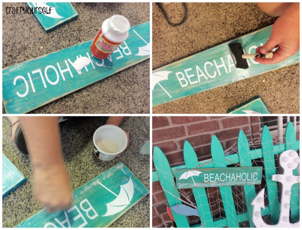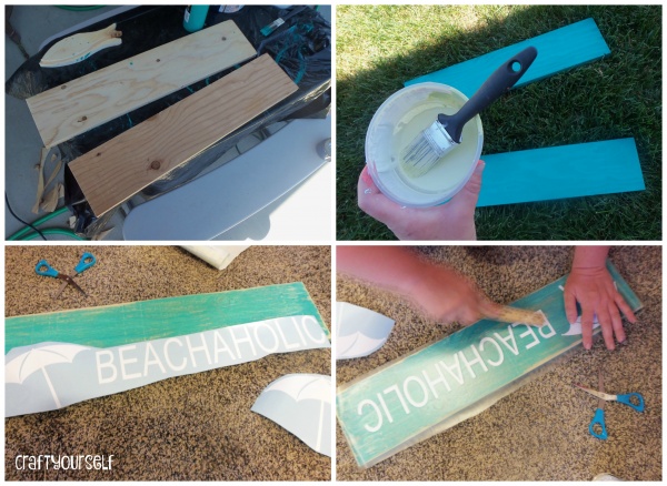 I used a board that was 5″ by 20″ I painted the board a teal blue green color. Next I cut an umbrella silhouette and the wording “beachaholic” out of white vinyl, using my personal cutting machine. I kept the wording and the silhouette pretty simple. After the board was dry, I sanded and distressed the board with a little white wash paint. I wanted the sign to look weathered as if it had been hanging on a beach cottage! When the board was completely dry I centered and added the vinyl design and wording.
