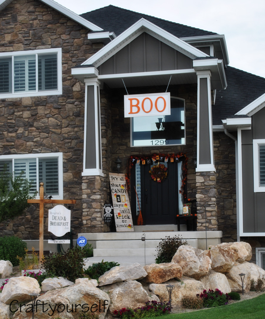 Credit goes where credit is deserved. My husband gets 100% credit on this big BOO sign. I told him I wanted something for Halloween hanging from the eyelets on my front porch that I use for my Christmas Bells at Christmas time and this is what he came up with!
