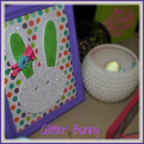 This is such a fun statement piece for Easter and it is very simple to create. First I purchased a frame from the dollar store, then spray painted the frame purple. Next, I chose a fun bright polka dot scrapbook paper for the back ground. I cut the scrapbook paper to the size of the frame and glued it to the backing of the frame. Someone had given me these darling white bunny chipboard cut out’s. If you don’t have the chipboard cut out’s like I did then you could easily print off a bunny silhouette on cardstock and hand cut these or use a personal cutting machine to create the bunny head. Before I covered my bunny in glitter I made a little template for the inside of the ears. I chose some patterned scrapbook paper and hand cut out the ears. I covered the bunny head in a good layer of mod podge and then dumped glitter all over it! before I embellished the bunny I Let it completely dry. Next I used the double sided sticky pop up dots to attach the inside of the ears to the bunny. I tied a ribbion around one ear and attached a felt flower with hot glue. Last I hot glued the bunny centered in the frame.