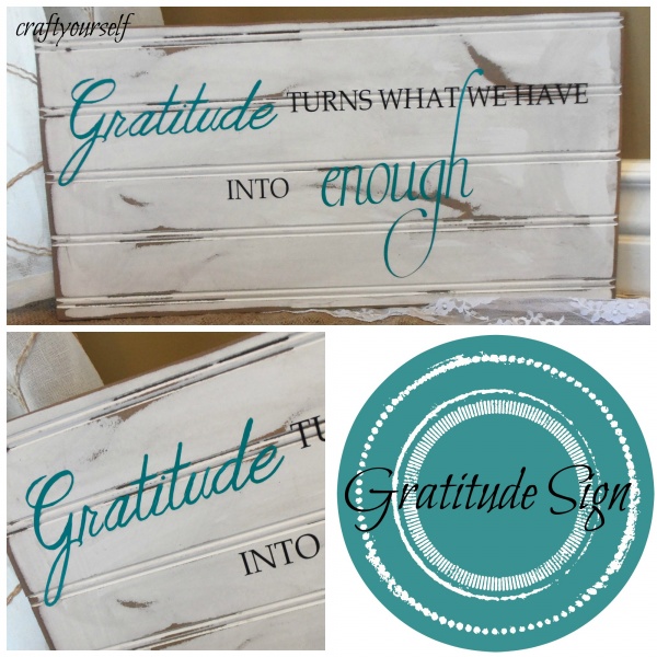My heart has pined after this gratitude sign for a few years! I just can’t pony up the $89 for it!!! You all know I am cheap skate! On my quest to create more fall and Thanksgiving décor for my home, I knew this sign was the perfect element that I was missing. I went out to the wood pile and found a few scraps of bead board. I sanded the bead board to give it a rustic look and then added some of my famous glaze to completed that rustic look. Next I set up a template with the wording on my computer. I cut the wording in teal and black vinyl and then applied it to the bead board! I couldn’t believe how quick and simple this project came together. I love being able to use scraps and things I have on hand to save money!!! I will proudly be displaying this board during this Thanksgiving season!