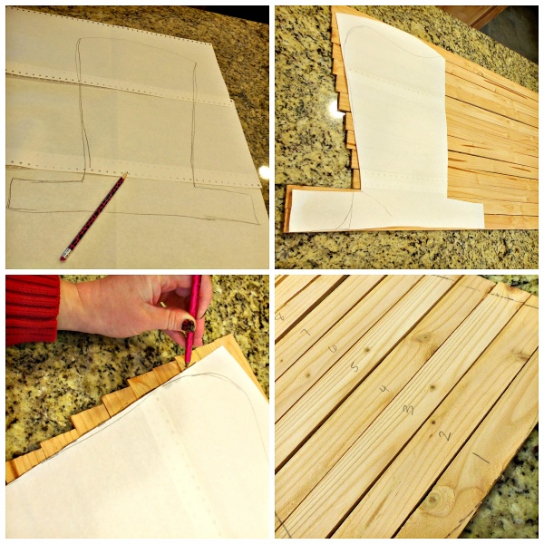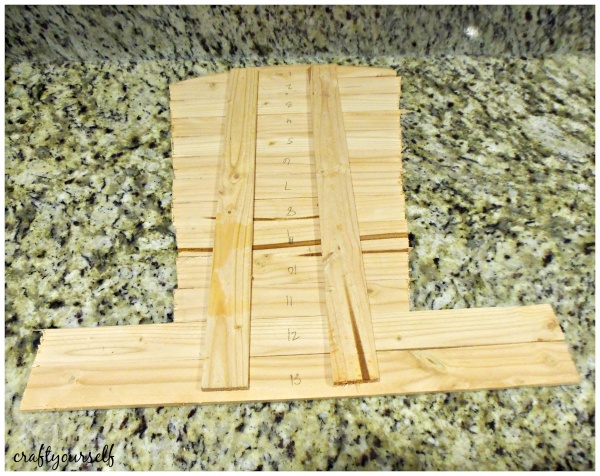 First I created a Leprechaun Hat template out of scrap paper. Then I laid out 13 lathing sticks, I placed the Leprechaun hat template on the lathing sticks and traced the patter onto the wood. I wrote numbers on each stick to keep them in order after I cut them.