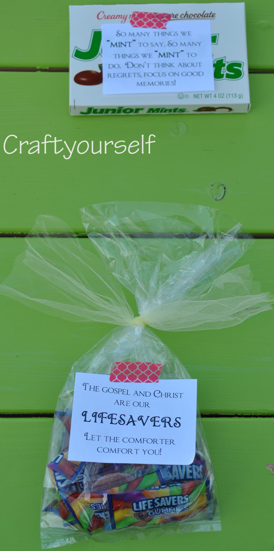 We added each saying to the candy with a little washi tape!