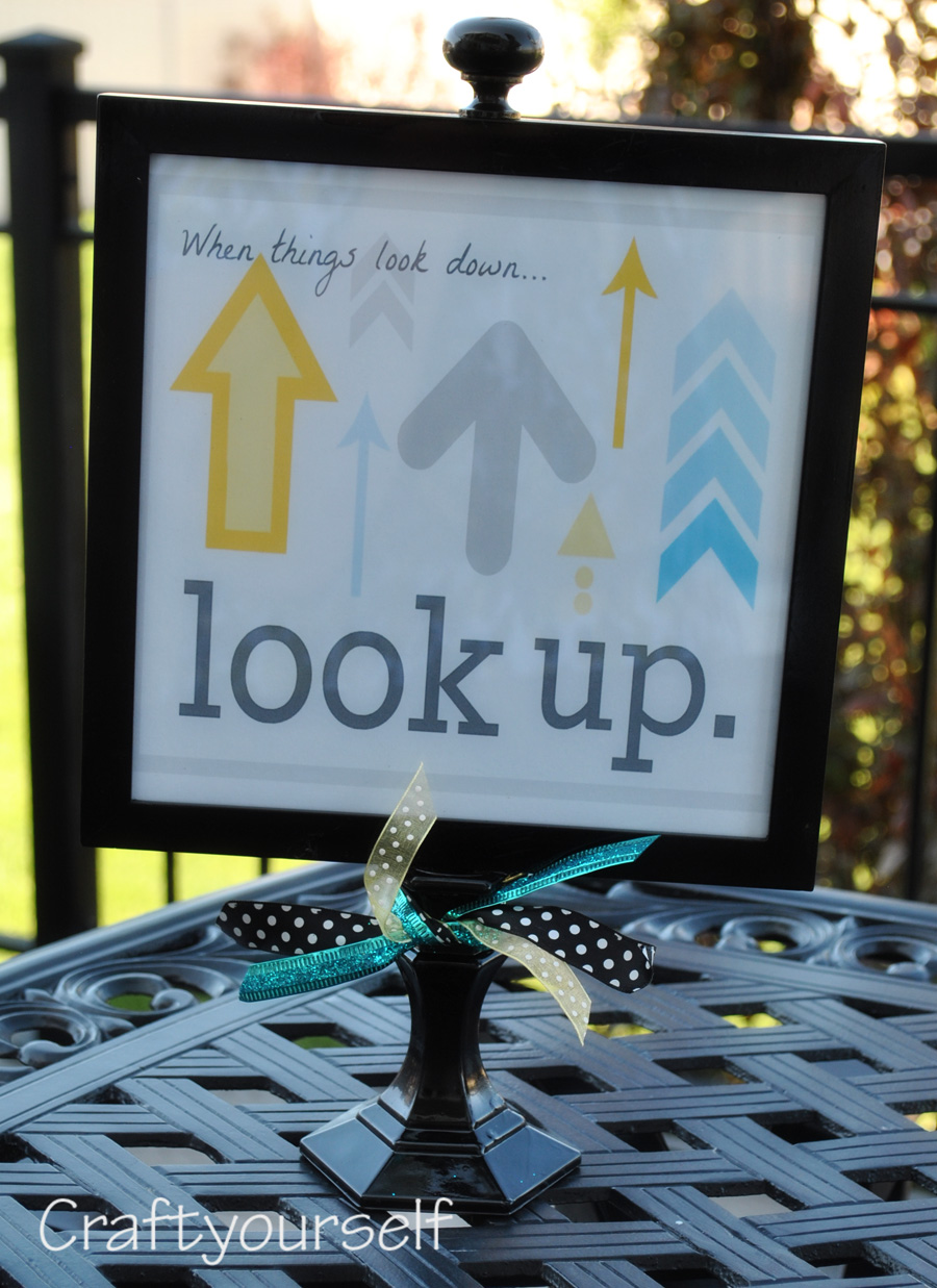Spray paint a dollar store candle stick, a picture frame, and a brass knob and whaa laa you have a cute pedestal frame. This can be interchangeable to put whatever printable you desire into it.