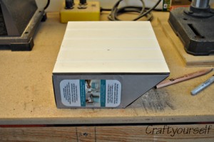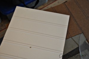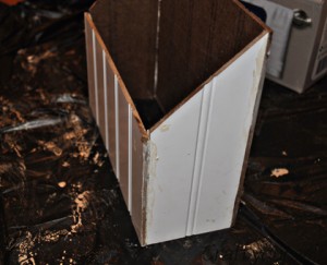 After I traced each edge of beadboard and cut the board out with the hand saw I glued the pieces together using liquid nails glue.