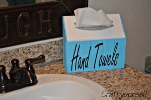 Once the edges were done drying I decided to paint the container a bright blue / turquoise color as I wanted to make sure it was bright and cheery! After two coats of blue I decided to cut out some lettering and add it to the front of the container so everyone knew they were hand towels!