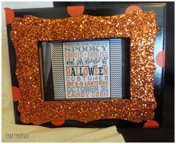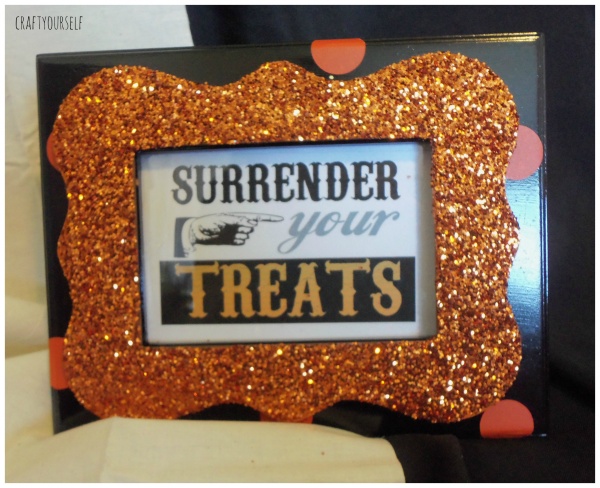 These glitter frames are such a fun addition to your Halloween décor. They are very simple to make, and were a huge hit at our Halloween party this year. I couldn’t believe how many people wanted a glitter frame over some of the larger prizes we were offering. To make the glitter frames, I purchase several 5 x7 frames that have a thick or large frame or edge, I paid around .25 per frame. Next I bought some of the wooden design frames at my local craft store, depending on the design they can be .59-$3. I generally by the cheaper ones that are $1 or less. I spray painted all of my thick frames black, and then cut different color dots out of vinyl using my personal cutting machine. I hand painted the wooden design frames and added glitter while the paint was still wet. After the frames were dry, I hot glued a glittered wooden design frame on top of the regular 5×7 frames. I found several free Halloween printables online, that I printed and placed in each frame. These were such a fun inexpensive prize to give away.