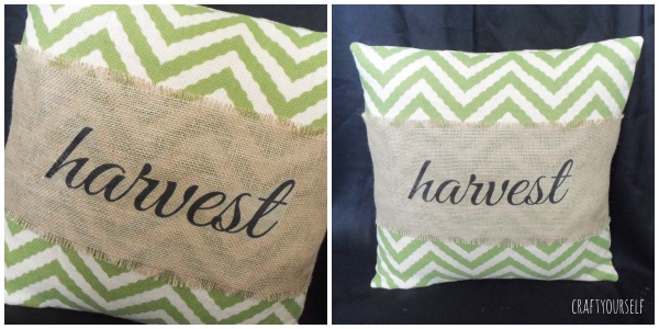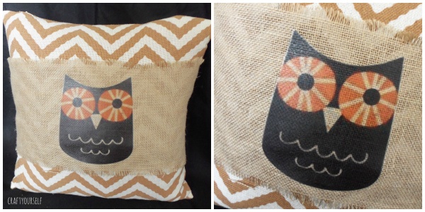 Right now I am in love with this iron on print and transfer paper. I have used many techniques to get images transferred on to fabric. The print and transfer paper is by far the easiest way to do it! There are so many fun free images all over the web! I totally utilized some of these free images and made a variety of pillows with this print and transfer technique. First up I made burlap pillow wraps for these 2 chevron pillows. On the first one I went into word and spelled Harvest in a fun font. One tip: If you are doing and words of lettering do forget to flip your image or it will be backwards when you iron it on! I found this darling owl which is a free printable, that I printed and ironed on the burlap wrap for the orange chevron pillow.