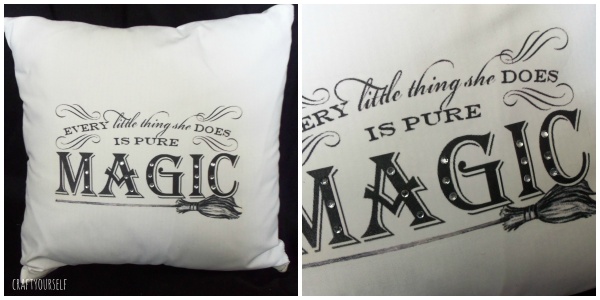 The last pillow I made everything she does is magic I found the free print at bhg Halloween party section. It was a free printable party plan. This pillow is my favorite Avry and I had to make them for ourselves.
