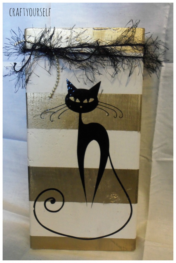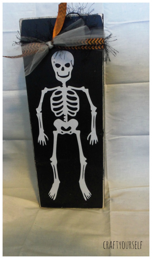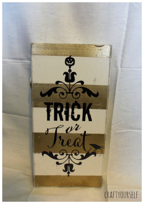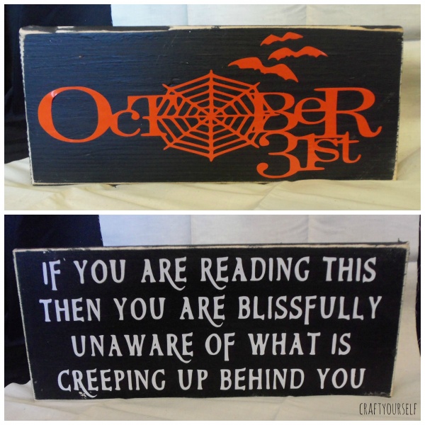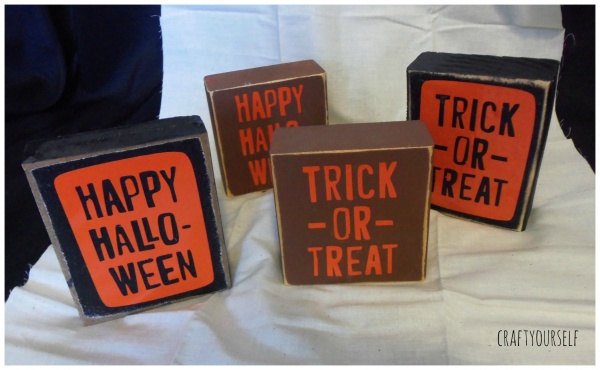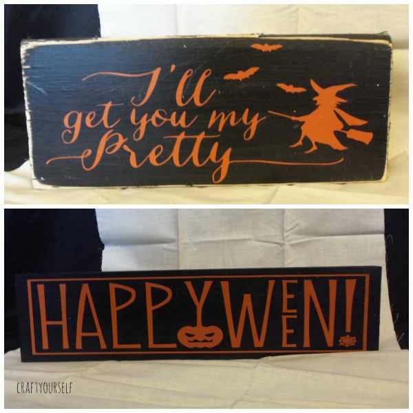 Because we love to give out so many gifts at our Halloween party, we have to find ways to make items on the cheap. A few of our favorite cheap craft supplies are: Paint, vinyl, and wood scraps. We have a local industrial park near by one of the companies has a pile of free wood, it’s usually pallets and other wooden crates. We also buy a lot of our paint at yard sales and in the mis-tint section at the hardware store. My favorite place for vinyl is Regional supply they have a section of remnants or end of the roll, you can get several yards for a few dollars. This year we had over 90 prizes to give away, several of them were wood and vinyl crafts that we put together. By using the free wood and discounted paint and vinyl we are able to make these crafts for under $1 per craft! If we didn’t have these options available we probably wouldn’t be able to make as many prizes. Here are a variety of wood and vinyl crafts we gave away at this years Halloween party.