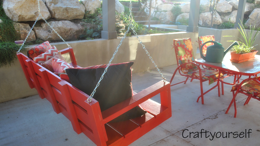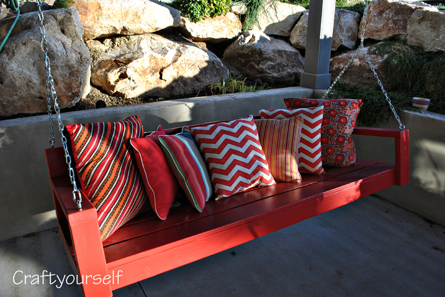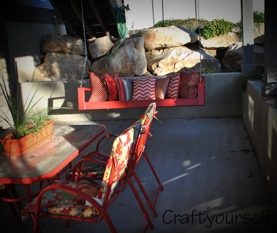 I love to entertain and am always looking for more seating room. Not only that but I love to sit and swing with my hubby. Sometimes in the evenings we will go and sit and swing for hours just talking and enjoying our yard. I wanted the swing to be under our deck in our courtyard and I wanted it to match my patio set. So RED is the color we painted it. (or should I say HE painted it)