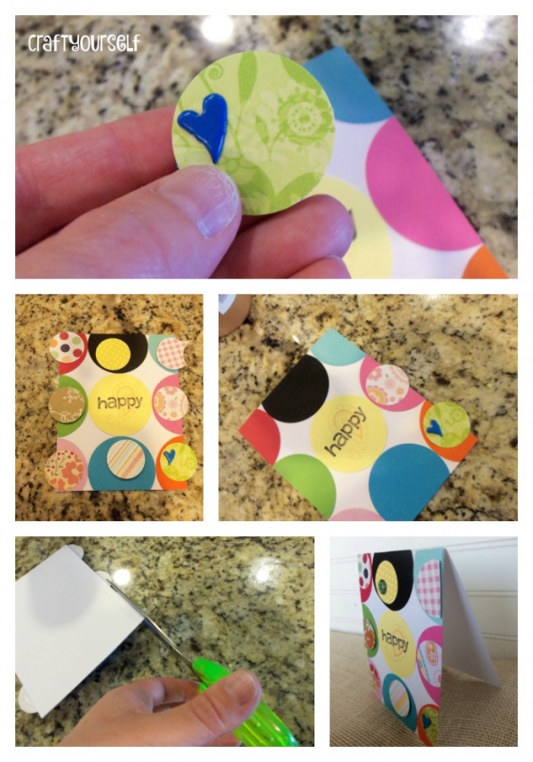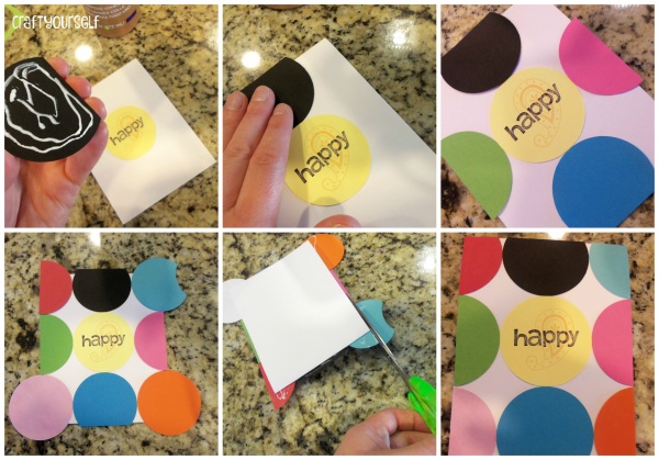 I glued the yellow circle in the center of my card and then glued the remaining colored circles around the yellow circle. Next I cut off any excess paper that did not match up with the edge of the card base.