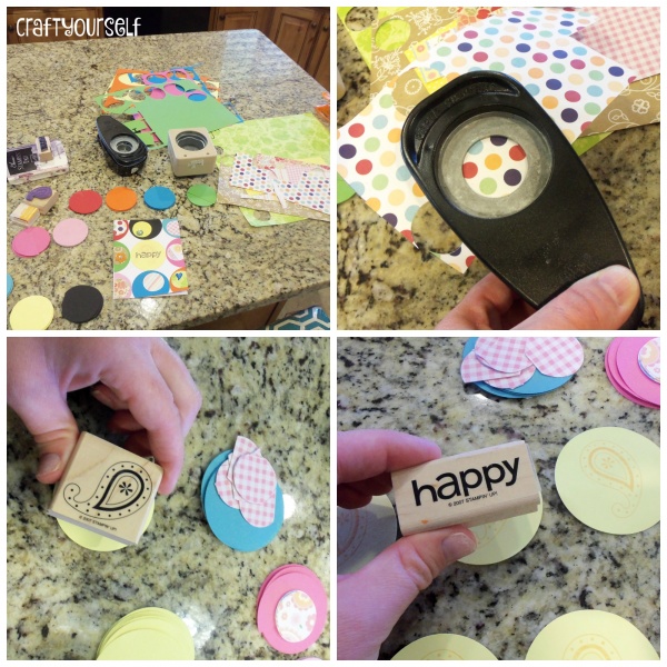 I don’t know about you but I have tons of scrap scrapbook paper and cardstock cluttering up my craft room. I often only use part of a sheet depending on the project and I hate to just throwing away the perfectly good unused portion so, into the scrap bin it goes! Well my scrap bin is overflowing with scrapbook paper and cardstock. So, for this months card group I knew I wanted to come up with a way to use some of these leftover scrap papers. Our theme this month is blank cards, I knew I could do whatever I wanted and even if I couldn’t use the same paper on each card it would be fine. The base of the card is white cardstock 81/2 by 11 cut in half. This is the only part of the card that is not from my scrap bin. I pulled out multiple colors of cardstock and using my 2 inch circle punch began punching circles out of multiple colors of cardstock. I punched a total of 9 circles for the base of the card. I stamped a paisley design and the word hello on the center of my yellow circle.