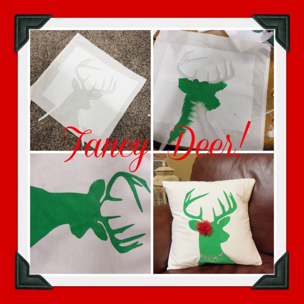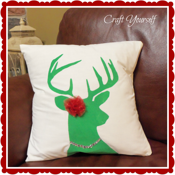 I found this idea for the fancy Deer pillow , except hers was made into an embroidery hoop. To make the pillow I created a stencil using SCAL and cut it out on my silhouette machine. I used the same freezer paper technique as mentioned above. I made the fabric flower and hot glued the jewels on.