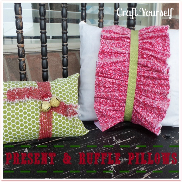 For the present pillow, I simply sewed a plain envelope pillow cover. Then I tied some ribbon and bells on. Super simple! For the ruffle pillow. I stared with a plain white pillow cover. I sewed the giant ruffle, then hot glued it on the front and hot glued a ribbon down the center. Both pillows were quick and easy to make.