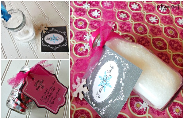 fill one of your jars with Epsom salt and the other jar with chocolates then attach coordinating tags.