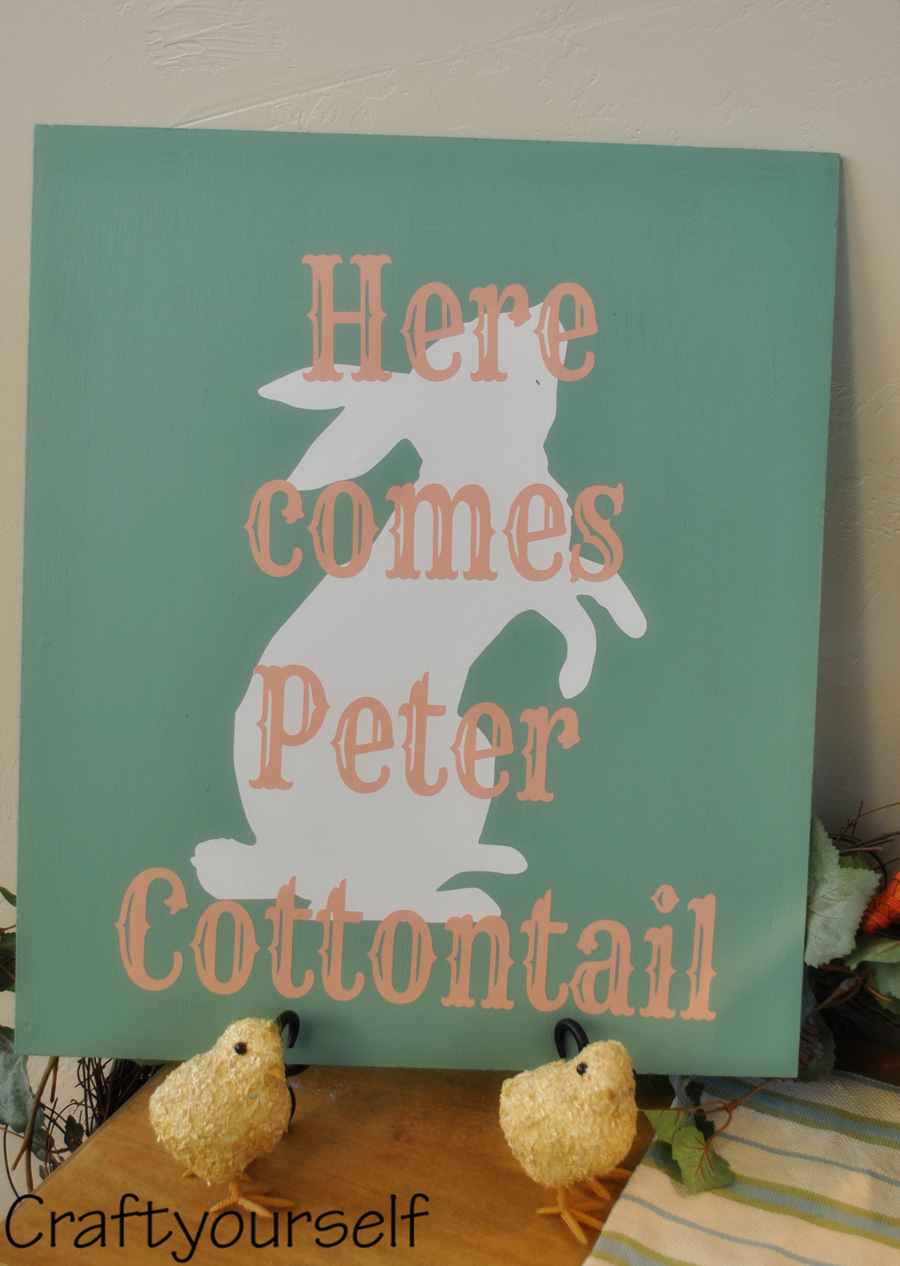 I took the same plaque that I did the St. Patrick’s day plaque on and just flipped it over. Two crafts in one! Painted this 12″x12″ 1/2″ particle board, Found an Image on Google images of the bunny and added the “Here comes Peter Cottontail” phrase over the top of my bunny in a pink/peach vinyl.