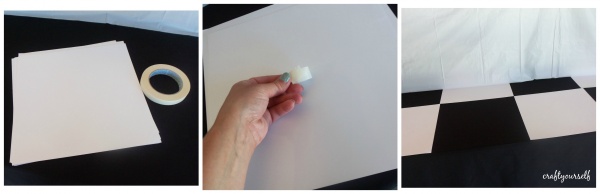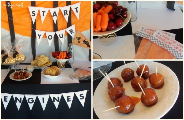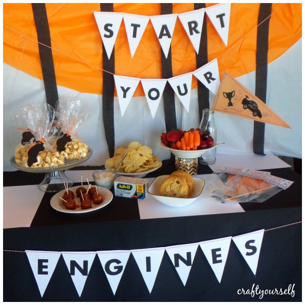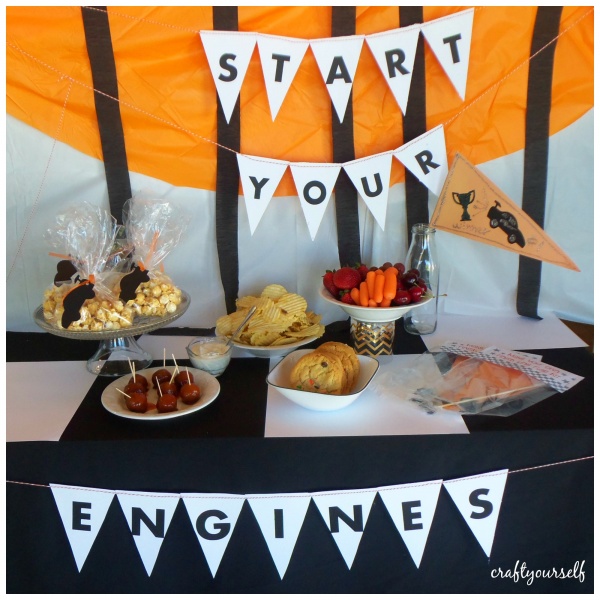 After I had the favor bags and kid activities taken care of finished I began to set up the food table for my party. I wanted to go with the checkered flag theme but didn’t have a tablecloth or any accent pieces in a checkered pattern. I ended up using a black tablecloth that I already had and some 12″ by 12″ white cardstock to create the checked pattern for my food table. It was really simple and came together in a few minutes. I used masking tape to tape each white card stock square to the tablecloth in a checkered pattern.