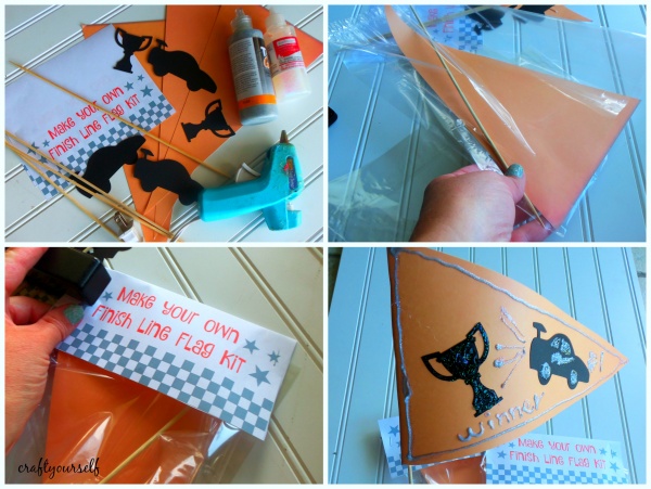 I knew a few kids would be coming to the party so I wanted to have an activity to help keep them busy. I put together a finish line flag kit which you can download here Finish line flag kit toppers. I cut card stock 6″ by 12″ in a pennant shape and also cut race cars and trophies out of black card stock using my personal cutting machine. If you don’t have a cutting machine you could also use stickers or print free images to decorate your flags with. I placed the pennant, some of the cutouts and a wooden skewer in a cellophane bag. I stapled my make your own finish line flag kit topper to the cellophane bag. I put these kits on a table with some glitter glue and crayons. The kids can decorate to their own imagination.