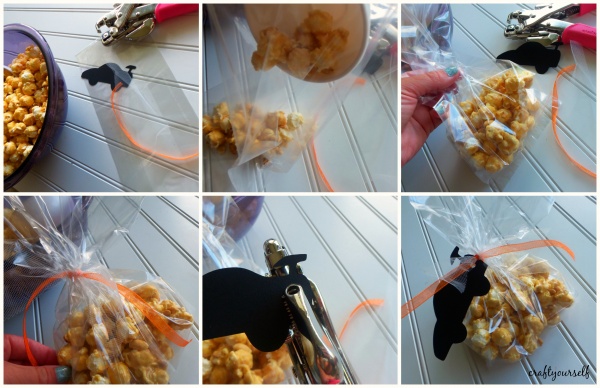 Once back home from the store I started getting ready for the party by making some party favor bags. I purchased some caramel coated popcorn and peanut mix, scooped 2 cups of the popcorn mix into cellophane bags and tied the bags with white and orange ribbon. I used my personal cutting machine to cut some race cars out of black cardstock, punched a hole in the back of the car and tied them to the bags.