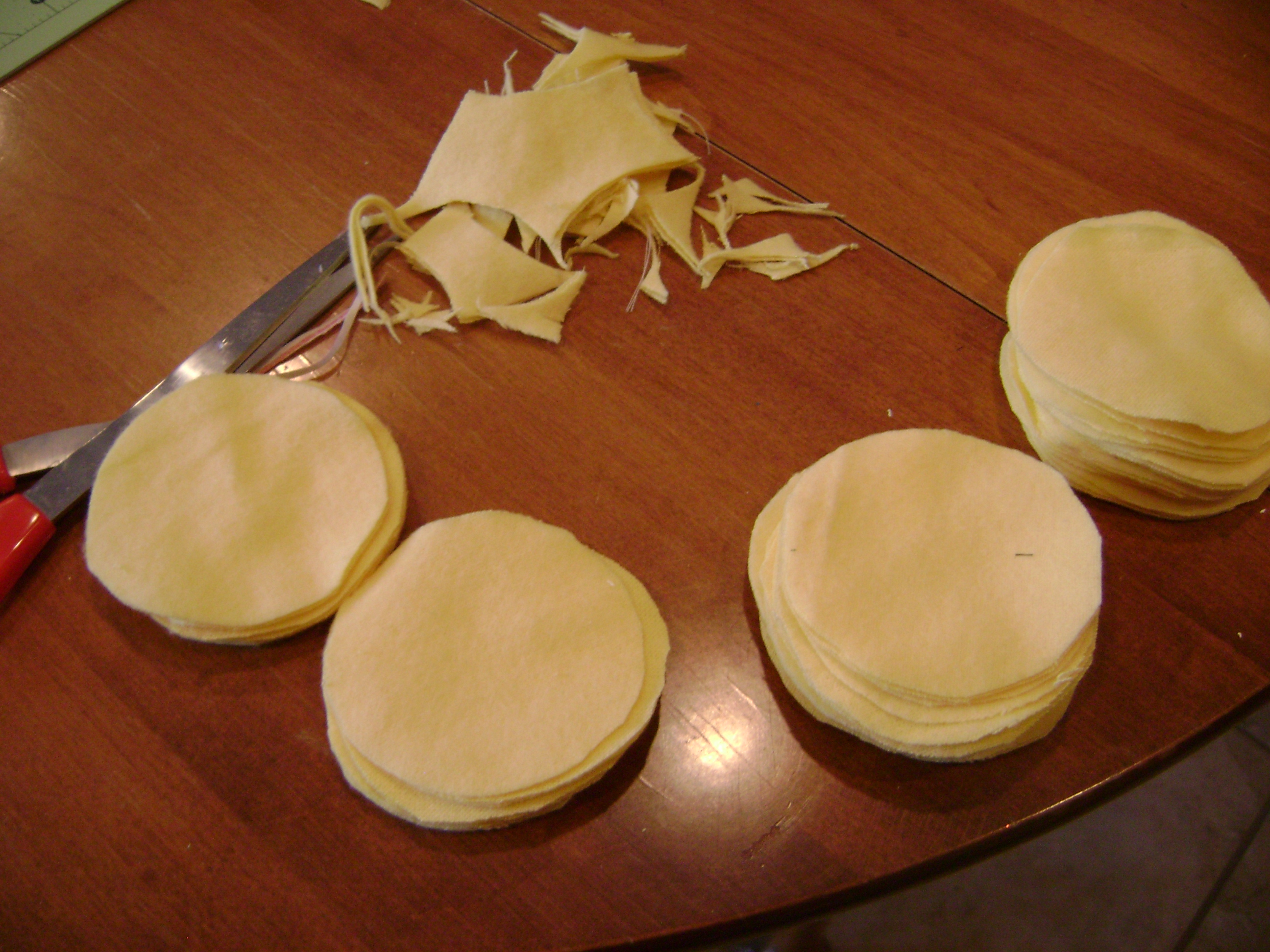 Depending on the size of the pillow you want to make will depend upon how many felt circles you will need to cut. I decided to do a longer skinnier pillow 24″ long and 8″ wide so I ended up cutting approximately 100 3″ round circles out of felt. I recommend buying the softer felt by the yard.