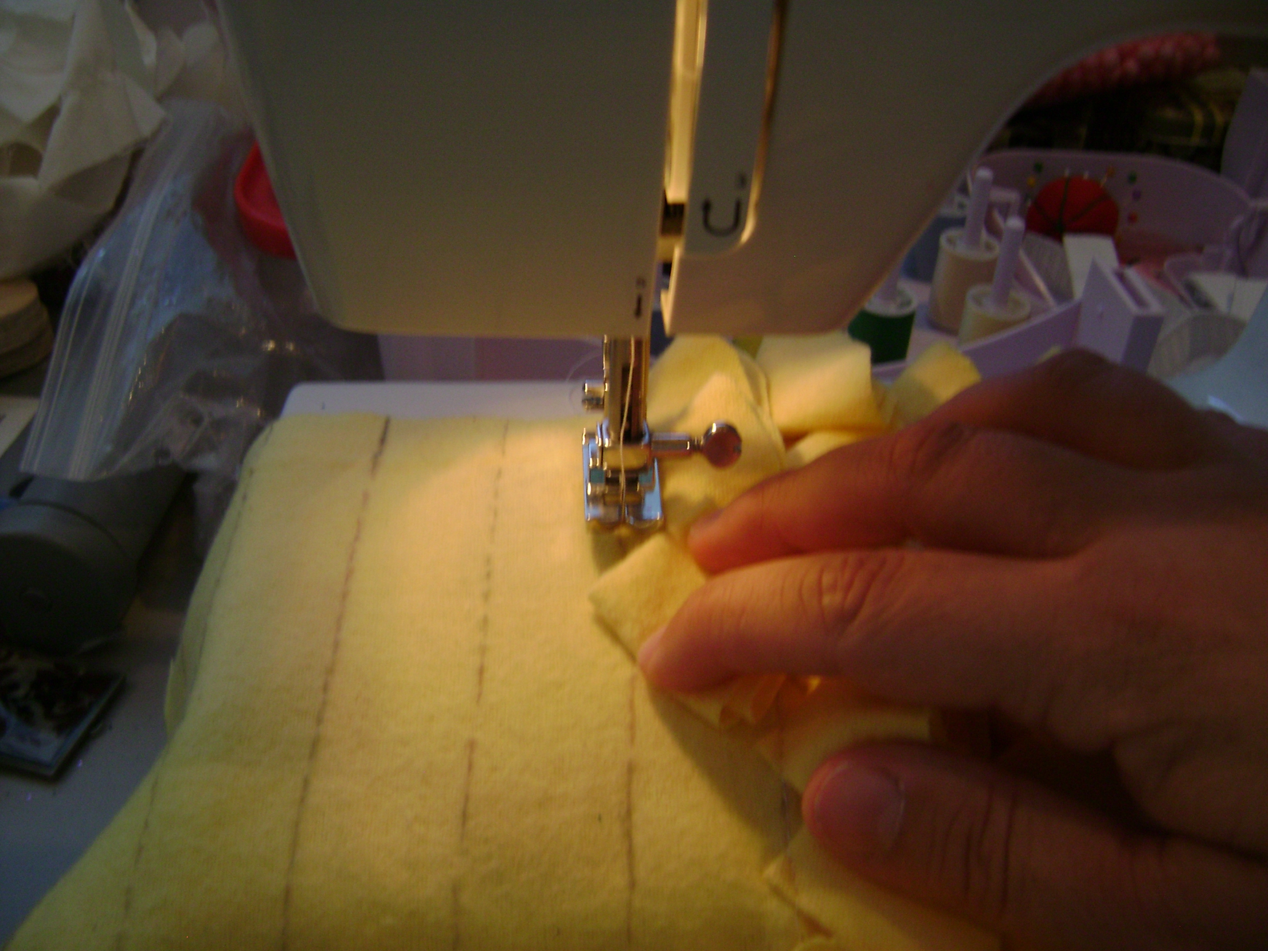 I have known a few people to randomly hand sew these into place but that to me would take forever! So when I was done sewing on circles to the strips I randomly filled in bare spots with circles to make it look a bit fuller.
