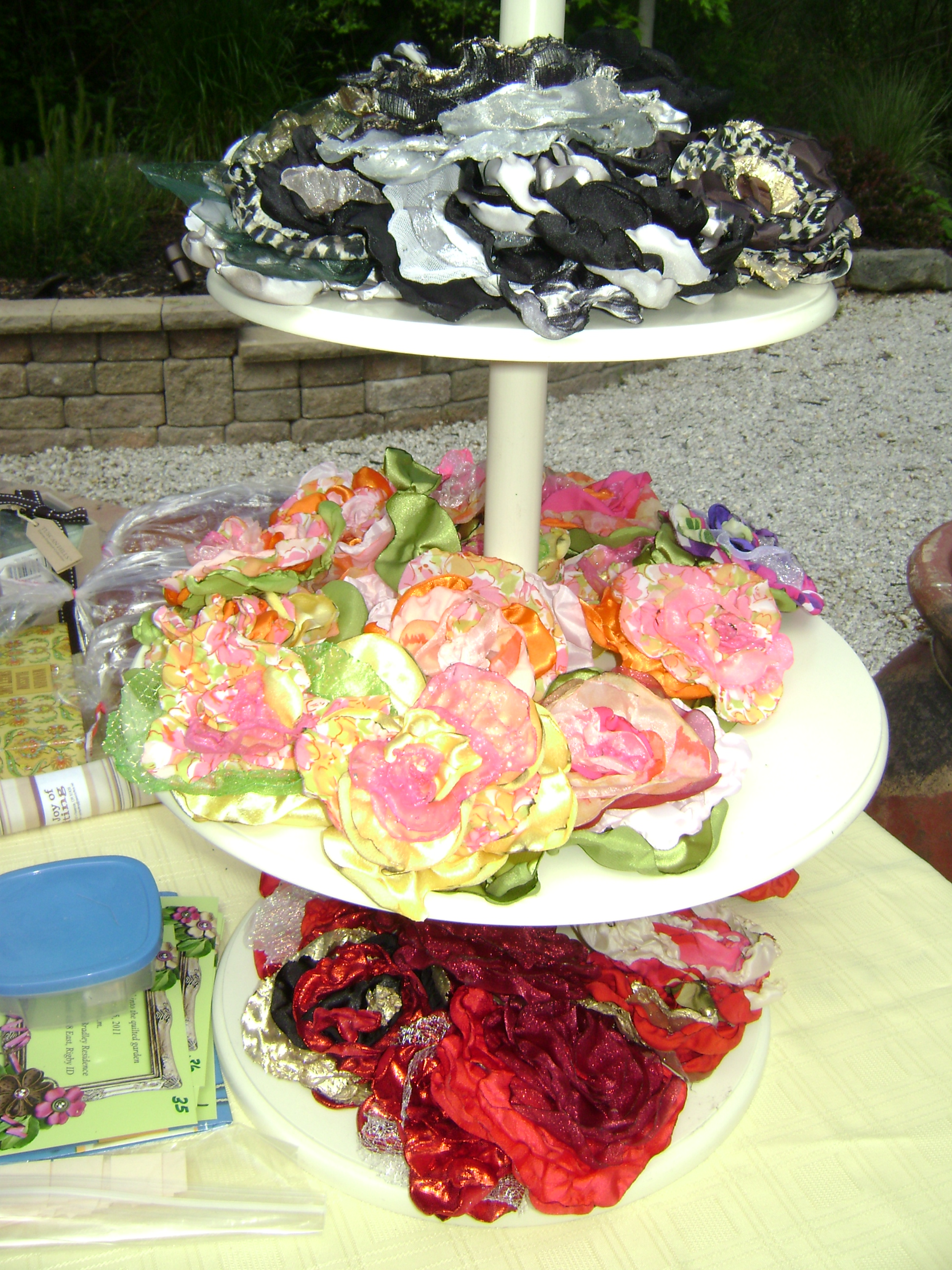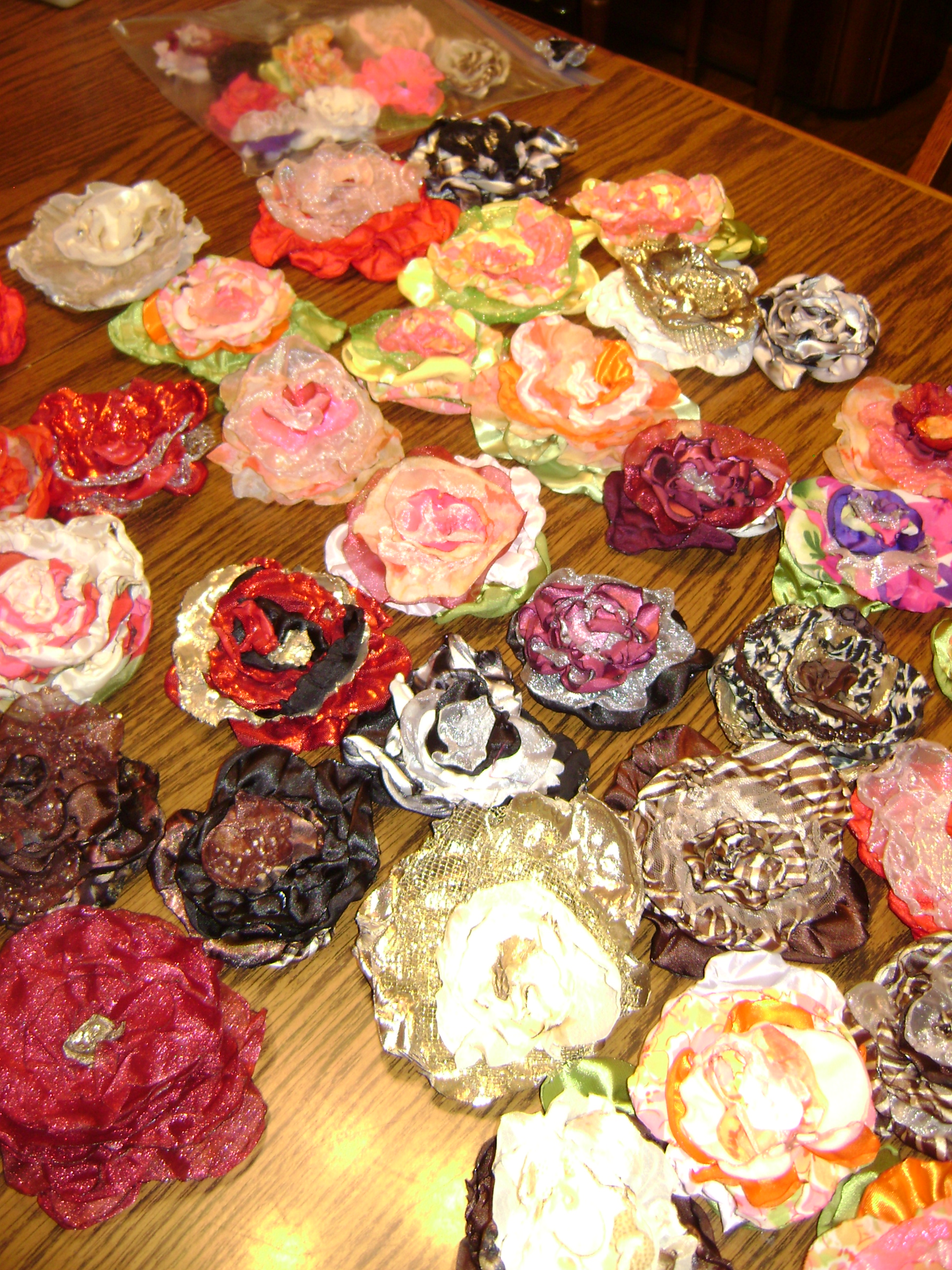 The flowers I have here in the pictures were all made up as party favors to ladies of a quilt guilt. You can pin these to your shirt, add them to a hat, put them on a headband, glue them onto a pair of flip flops etc. you can basically do whatever you would like with them.