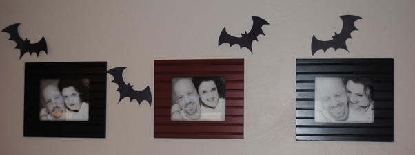 Today I am going to show you a few simple and very cheap ideas to decorate your house without spending very much! First off is my bat wall. I took a bat templet which I found online just under a google search then I traced it onto black construction paper and cut them out then attached them to my wall. Super easy!