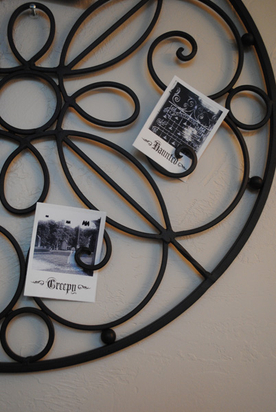 Here is another fun idea that I came up with. I got these fun creepy black and white photos and just inserted them into my wrought iron wall hanging. I have had quite a few comments on how fun those creepy pictures are!