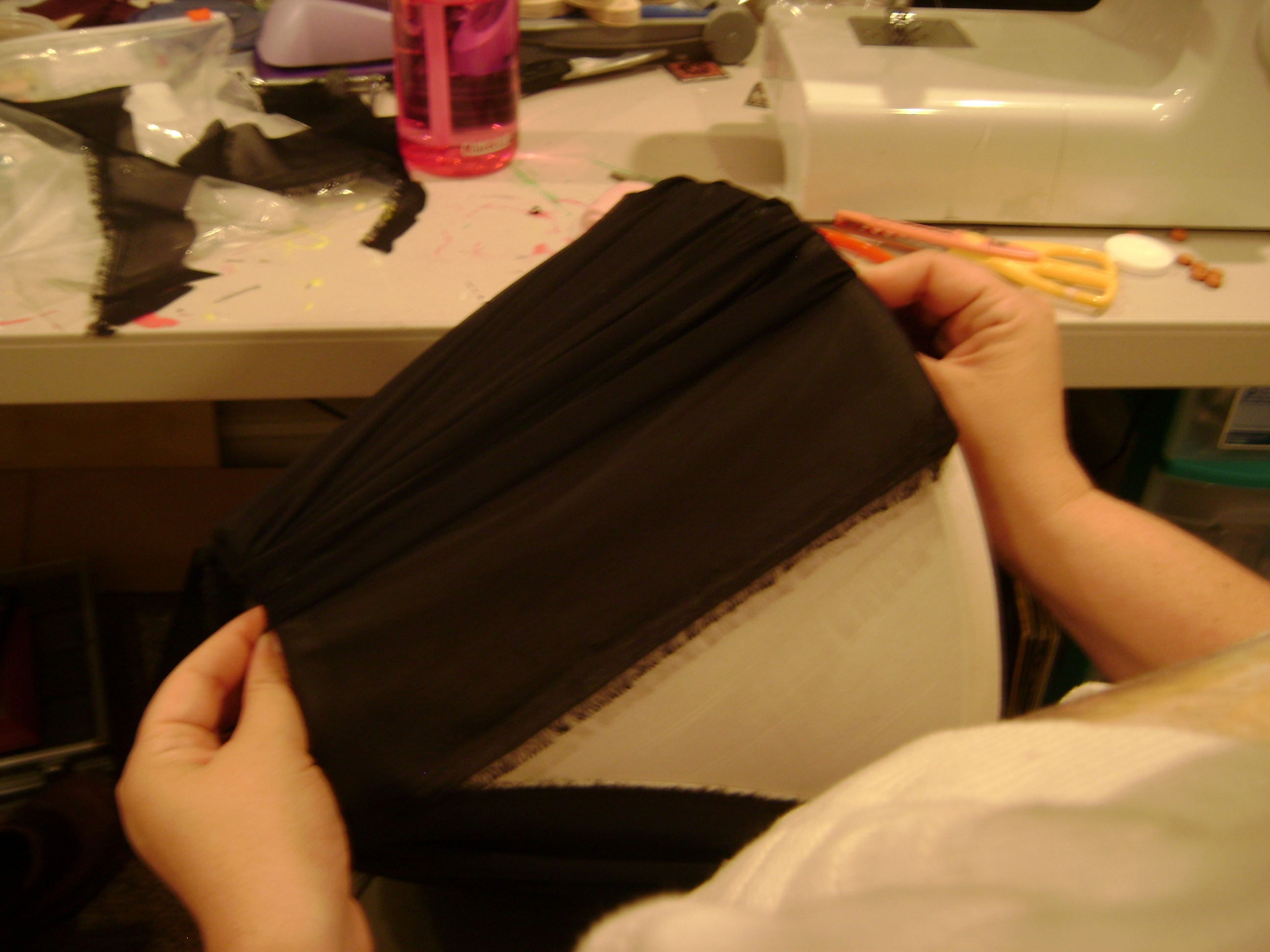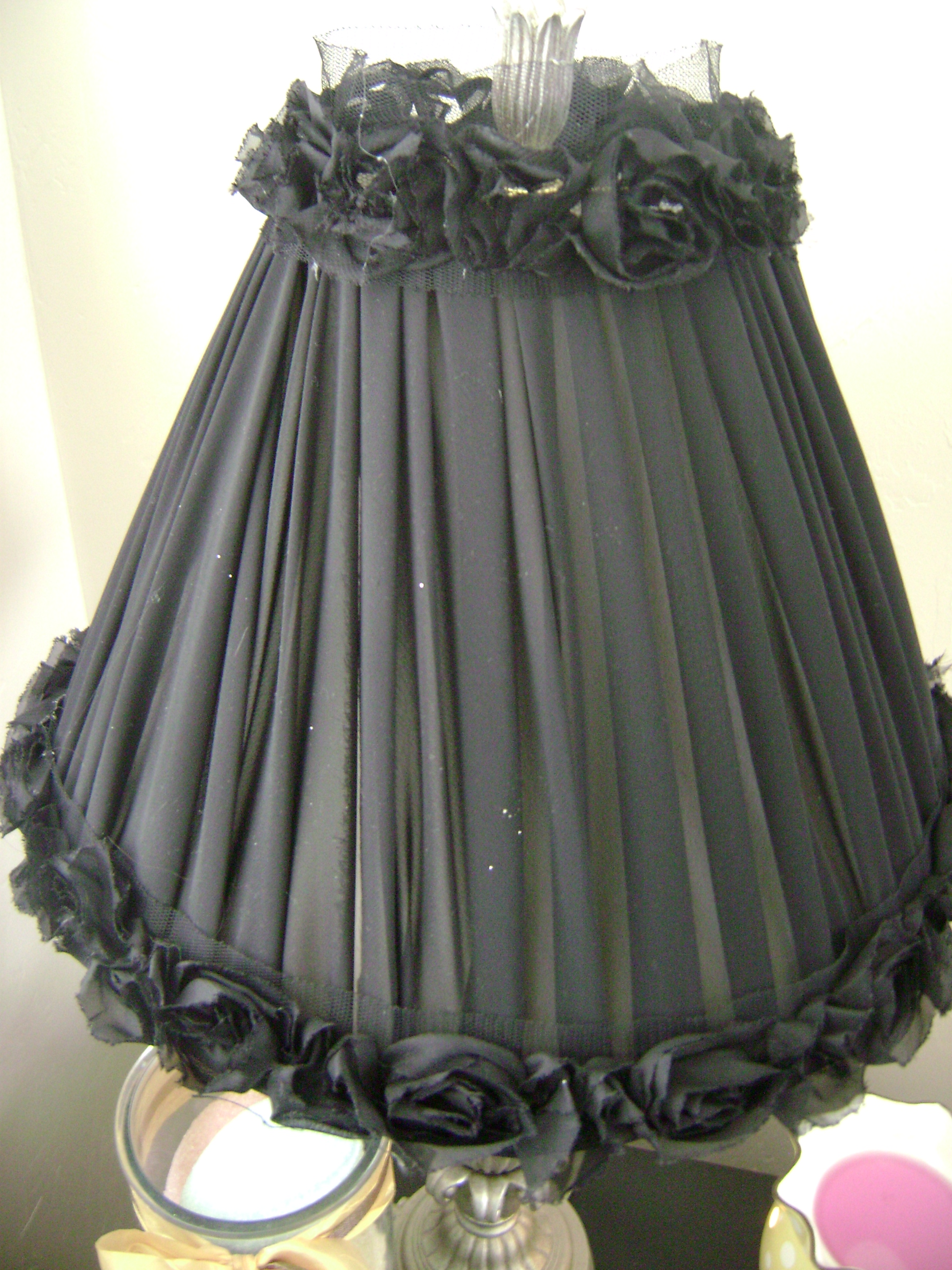 As I was gluing the material to keep it out of the way I trimmed the excess that was hanging over the edge of the lampshade. I also pulled as tight as I could to give the material a tights look as the gathering wouldn’t look as good if it was loose. I chose to leave the lamp shade white because with the black overlay I worried about the lamps still letting out enough light. I took my long rosette strand and glued it along the base of the shade and again along the top of the shade.