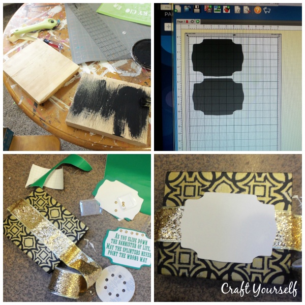 Using some wood scraps or any wood you have kicking around paint them black. The background is a great geometric pattern. You can cut a template using contact paper on your personal cutting machine. Next placing the pattern over the painted board. You’ll want to use a gold permanent marker to color in the design. Next cut the Irish saying in green vinyl. The original plan was to place the wording directly over the pattern.