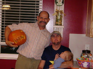Here is Jason (holding nephew Rowan) and his friend Mark after carving their awesome pumpkin!