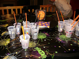 Before the party began Maeli & I set out decorating it in Halloween themed items, Maeli made these cups to drink out of by putting a skeleton straw in each one then adding a “spooky” sticker onto the front.