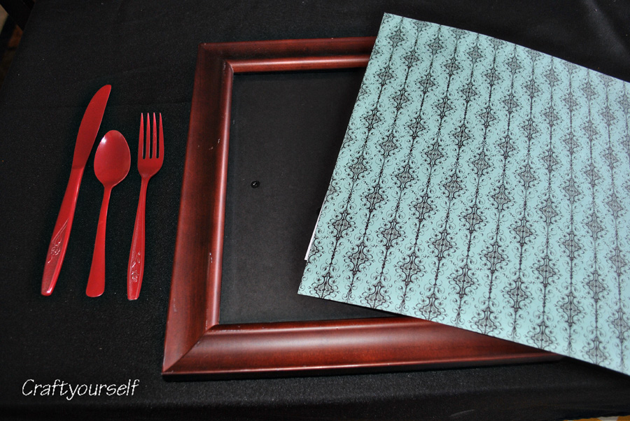 I gathered my supplies – An 8×10 frame, turquoise and black scrapbook paper and my red spray painted utensils.