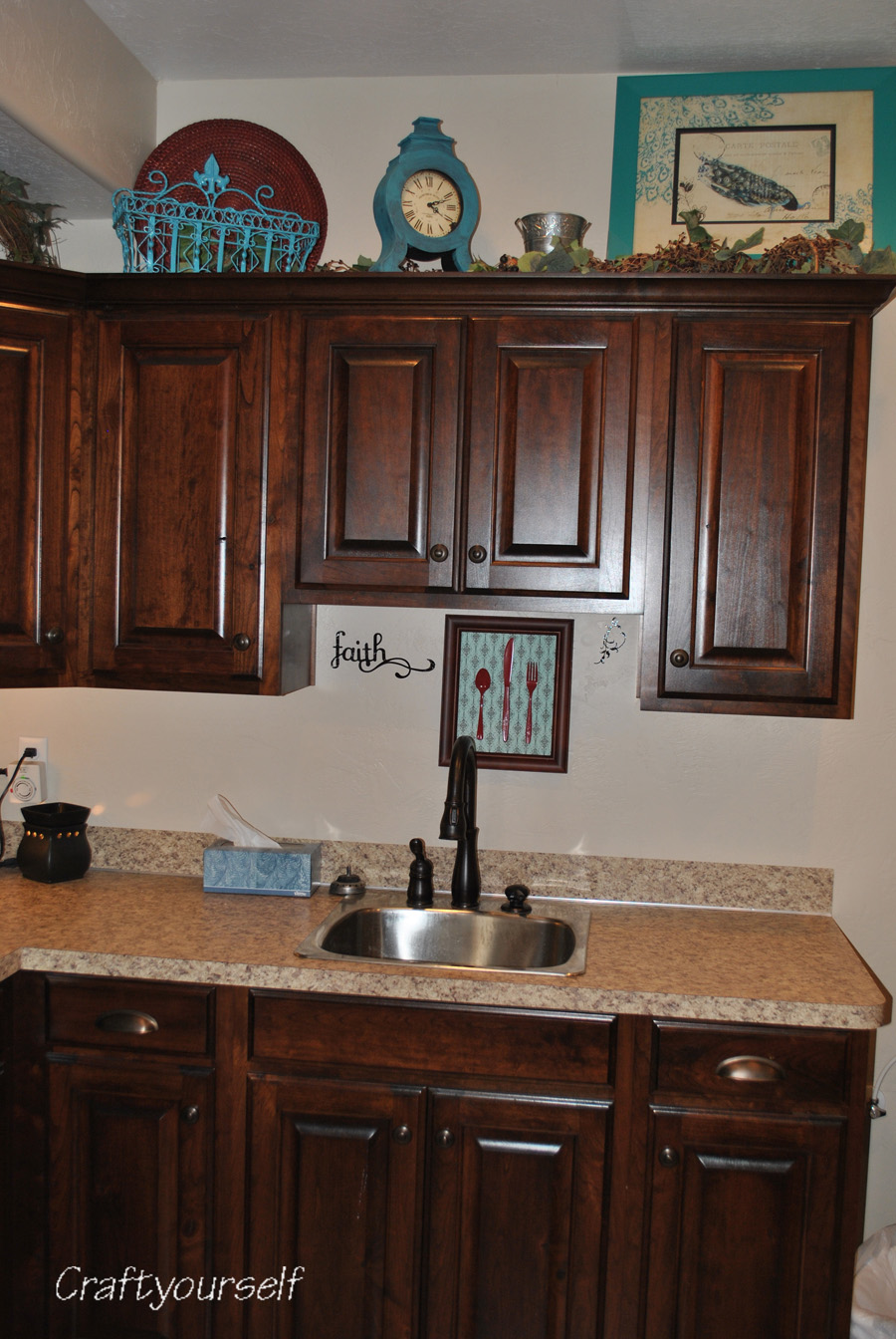 I am redoing my family room in my basement and if you remember my post on these pillows you will remember that I am doing my basement in Red and turquoise. Not aqua but bright BOLD turquoise. Well, my basement family room also has a kitchenette attached to it that hosts a microwave, sink and full sized refrigerator. I also have a small dining area with a table that will hopefully someday get refinished. Anyways, this kitchenette has needed some spice to it so I decided to add this Knife fork and spoon craft right above the kitchenette sink.