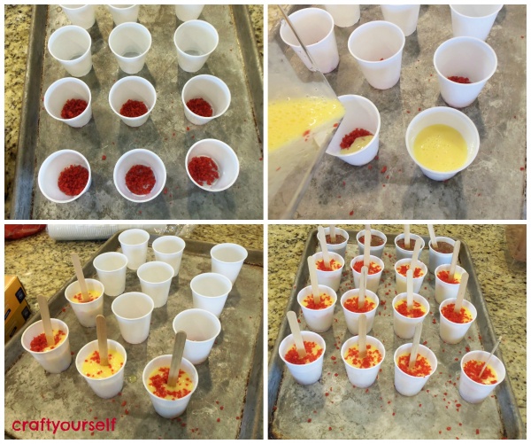 Place 4 licorice pieces in a blender or food processor and pulse until the licorice is chopped into small bits. Pour your licorice bits into a bowl and rinse out your blender. I just went a head and made the pudding in my blender, I figured it would save time and less clean up. Place milk and pudding mix into your blender, I followed the directions for amounts of milk that were on the pudding package. Set up cups on a baking pan and sprinkle a few teaspoons of licorice bits into each cup, next pour pudding 3/4 of the way to the top of the cup. Sprinkle more licorice bits on top of pudding, place craft sticks in the center of each cup. The pudding had set up at this point and the sticks held themselves in place really well. Place pan in freezer let freeze for 3-4 hours or until frozen.
