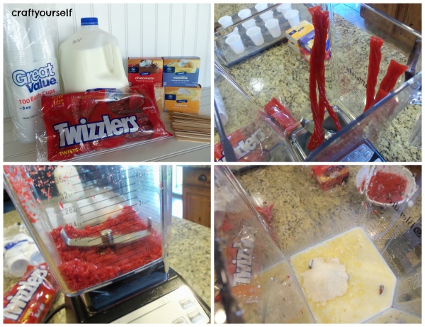 - Place 4 licorice pieces in a blender or food processor and pulse until the licorice is chopped into small bits. Pour your licorice bits into a bowl and rinse out your blender. Place milk and pudding mix into your blender, follow the directions for amounts of milk that are on the pudding package. Set up cups on a baking pan and sprinkle a few teaspoons of licorice bits into each cup, next pour pudding ¾ of the way to the top of the cup. Sprinkle more licorice bits on top of pudding, place craft sticks in the center of each cup. Place pan in freezer let freeze for 3-4 hours or until frozen.