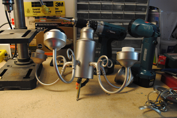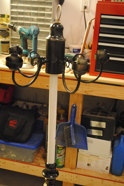 Then came along the Candelabra. I see it – I want it. With 2 brass $2.00 garage sale lamps, a generous girlfriend sacrificing one of her garage sale finds (an old Chandelier) for $5.00 some PVC pipe, a very loving spouse, a $3.00 metal threaded dowel, a $1.00 can of black spray paint and some patience. I got it!!