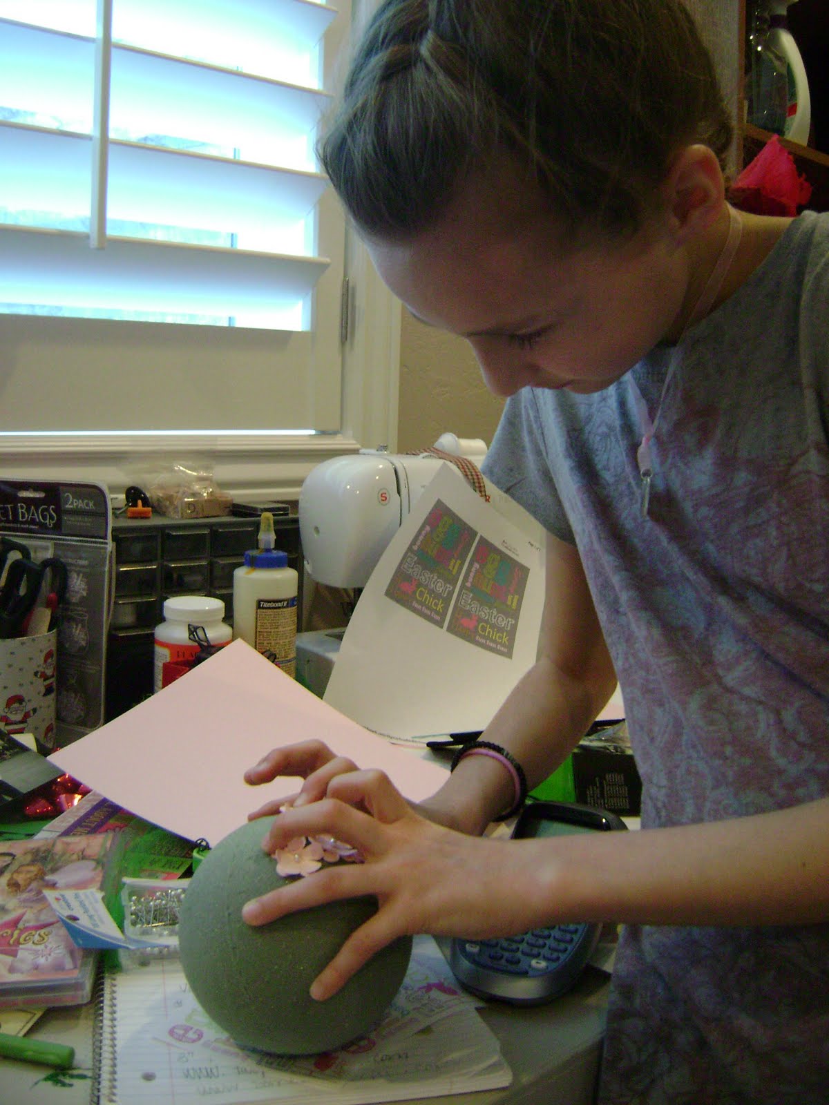 She went to work on it. I showed her what to do and it is easy enough for a child to do! The ball I had was much bigger than the one Courtney used in the tutorial so about half way through Maeli got burned out so I finished it up.