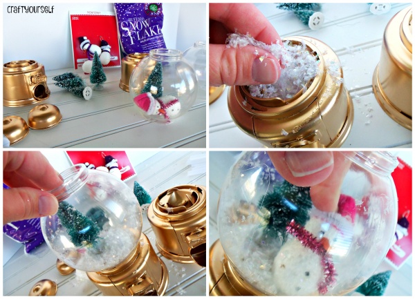 I replaced the top of the gum ball machine and now I have a darling mini Christmas Snow globe. This project was very simple and inexpensive to create, besides the dry time on the paint the project came together in under 10 minutes. These could make fun gifts to give away to neighbors and friends.
