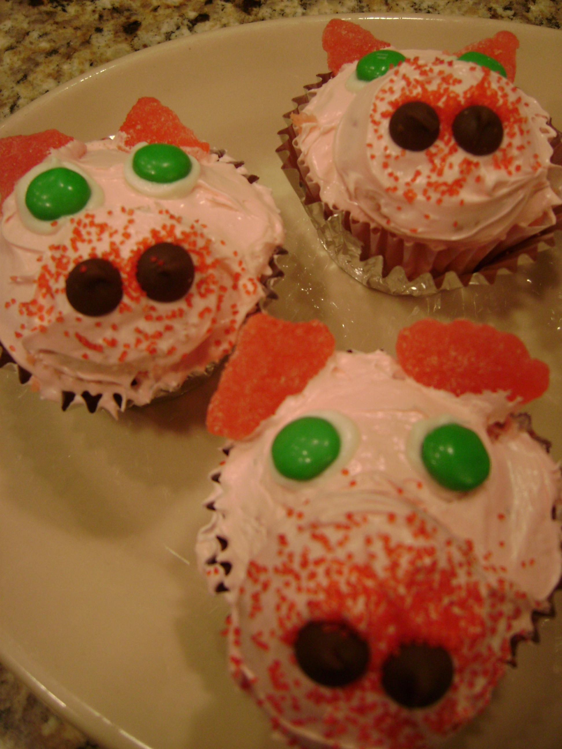 - Frost standard cupcakes. Place mini cupcakes upside down, off center of each standard cupcake and frost. I found the nose was very large so I cut my mini cupcakes in half. Decorate with gumdrops for ears, Use white icing and M&M's for eyes, and decorate nose with chocolate chips and red sprinkling sugar