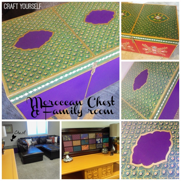 If you follow this blog. I am sure you have noticed that Avry and I are huge garage sale/ thrifters. I love to create things on the cheap! Anytime I can save a buck I do! When people ask me what my style is I like to refer to it as Garage sale glam and sometimes when you are thrifty it requires a little effort and work on your part. I also love to give items my personal touch and to have the feeling of accomplishment when the project is complete. With all that said I found this great chest at a yard sale for $10. I was going to leave it how it was but, the colors weren’t really working with what I already had in my family room. I taped off sections that I wanted to keep and left open the red spaces. I took this beauty outside and spray painted it with purple paint. After it was dry I peeled back the tape, and then went over the yellow lines with a gold sharpie marker. I am still trying to decide if I am going to add a design in the boxes. For now I love that a little spray paint and a sharpie marker could take this piece to a whole new level. It matches my Moroccan style family room now!