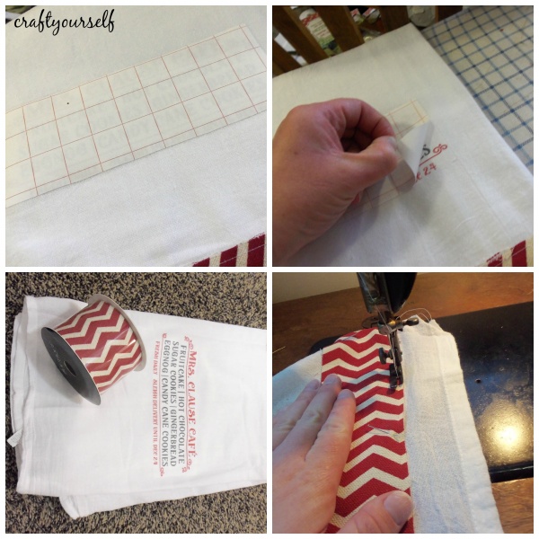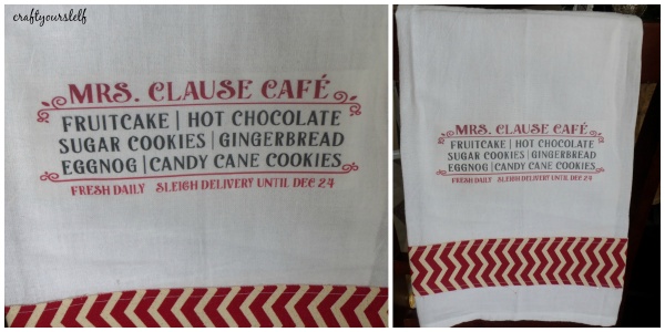 Another great find over at Fynes designs. She has a darling Mrs. Clause Café sign!!! I am envious of it! I would love to make one to hang in my kitchen for the holidays. However my projects list is just to long, I will just to be content with my version ” A kitchen towel”. Have you ever used printable iron on sheets? They are one of my favorite things. They are easy to use and make projects so easy. I printed the Mrs. Clause Café sign onto one of these iron on sheets. Next I centered and ironed it onto one of my flour sack towels. I pinned a sewed a strip of wide red chevron along the bottom of the towel for a little extra oomph!
