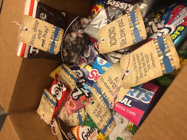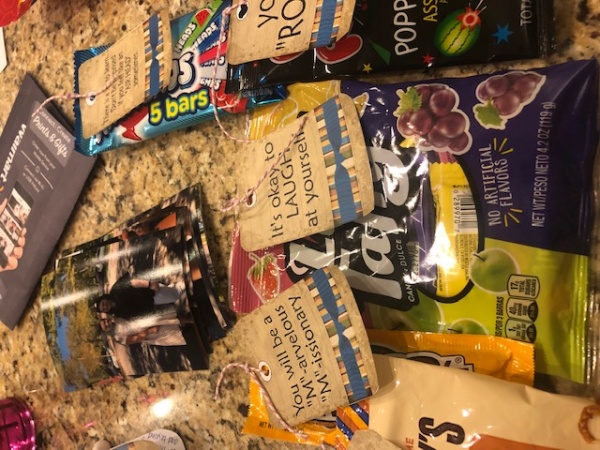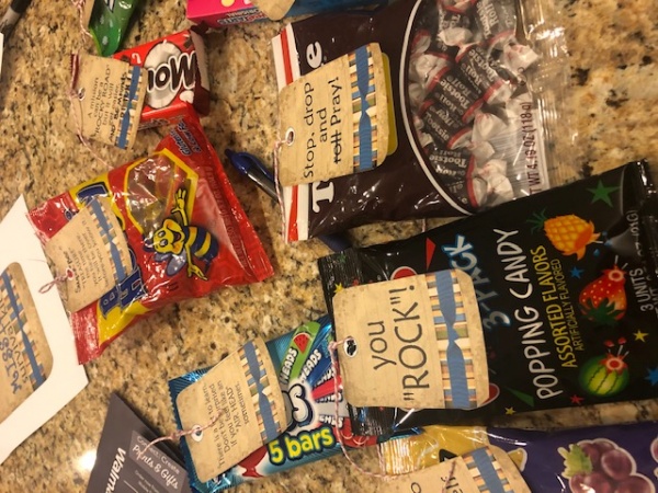 I purchased Laffy Taffy’s, M&M’s, Tootsie Rolls, Sweettarts, Mounds, Hershey kisses, Poprocks, Bit-o-honey, Lifesavers, goldfish, pretzels,
