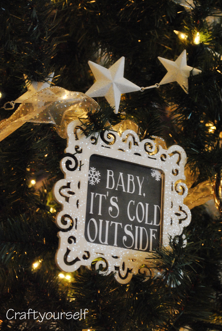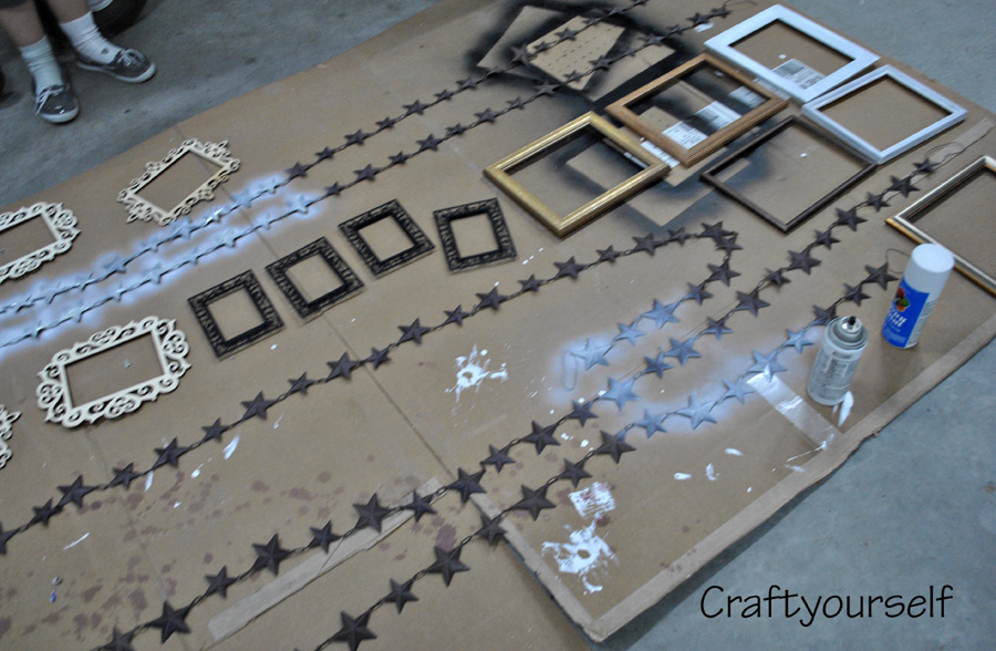 I was on a mission to add some items to my white Christmas tree that is in my home office. My friend picked up these thin wood frames at Michael’s on clearance for .25 cents each and brought me a stack back in June or July. I wondered what the heck I would ever do with them but sure enough found an idea! I also had purchased some old tin rustic star garlands years and years ago for my Christmas tree. They have sat in a box the past 3 Christmas’s until this year!! SO WHIP OUT THE SPRAY PAINT and watch what I can create